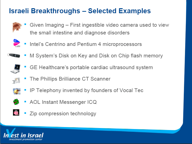 Select Israeli breakthroughs in technology include: Intel’s Centrino chip, Flash memory key, Zip compression, IP Phone and more…