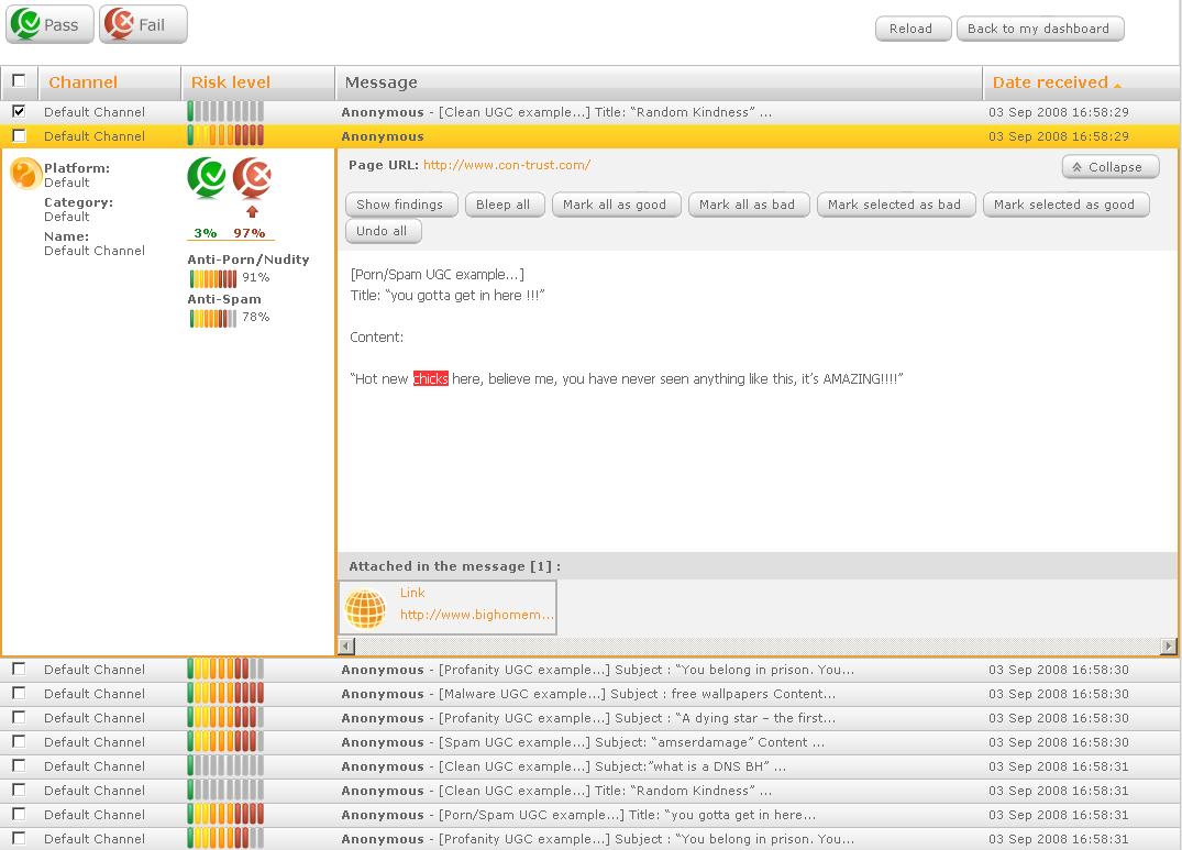 Contrust gives a recommendation to approve or decline. Content reputation systems show the moderator what other moderators did in similar messages. For example, there’s a post that doesn’t have anything suspicious but includes a link to a porn site. The system lets you preview the page on the CRM system. The users can also tag words inside the message and ‘mark as bad’, as opposed to the old systems that include a queue of messages that have no tagging.